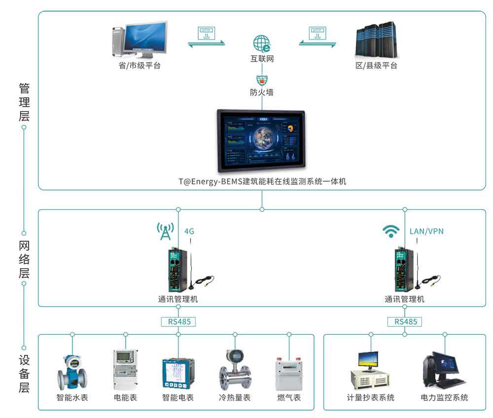 網絡層:以建筑內部通訊管理機及相關網絡線路組成,通訊管理機用于末端計量表計和第三方監測系統內能耗數據的采集、存儲、協議轉換并上傳至“能耗管理一體機”。根據監測點位的數量和位置不同,可任意擴展通訊管理機的數量。