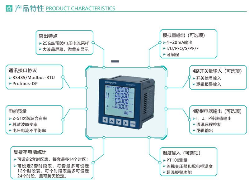 PUMG730系列多功能儀表具有精確的電力參數測量,雙向四象限電能計量、統計、記錄等功能。采用先進的ARM處理器和數字信號處理技術設計而成。