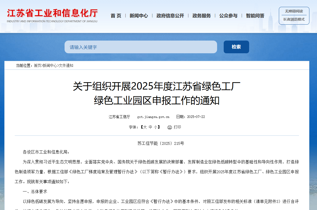為發揮制造業在綠色低碳轉型中的基礎性和導向性作用,打造綠色制造領軍力量,近日,江蘇省工信廳組織開展2025年度江蘇省綠色工廠、綠色工業園區申報工作。深入貫徹習近平生態文明思想,全面落實黨中央、國務院關于綠色低碳發展的決策部署,發揮制造業在綠色低碳轉型中的基礎性和導向性作用,打造綠色制造領軍力量,根據工信部《綠色工廠梯度培育及管理暫行辦法》(以下簡稱《暫行辦法》)要求,組織開展2025年度江蘇省綠色工廠、綠色工業園區申報工作。