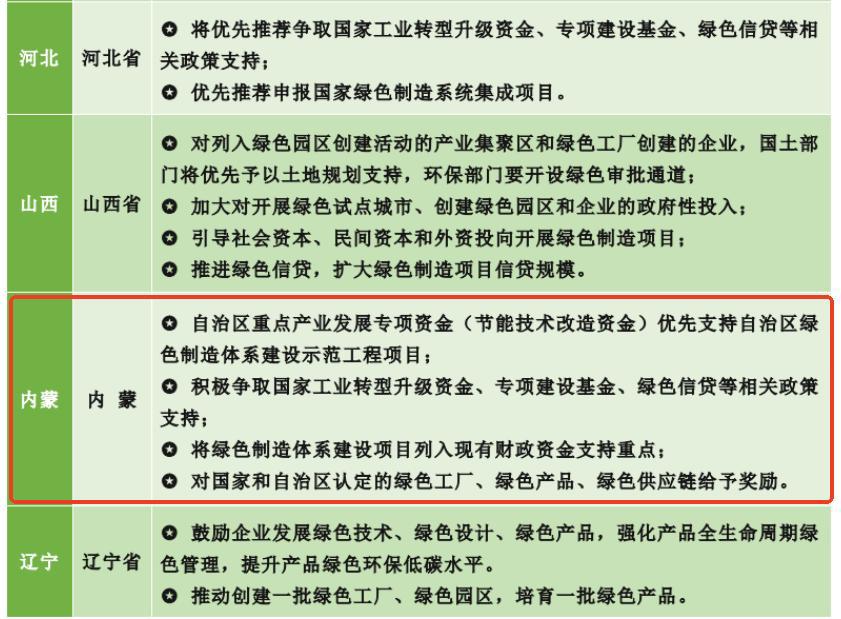 關(guān)于綠色工廠,不同的省市都有不同的鼓勵性政策補(bǔ)貼,下圖內(nèi)蒙古省的政策補(bǔ)貼: