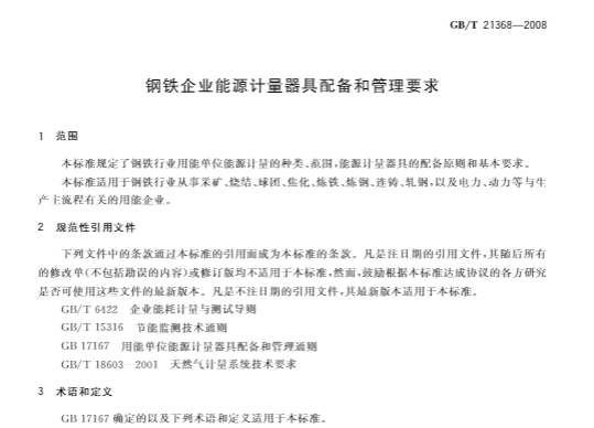 本標準規定了鋼鐵行業用能單位能配計量的種類、范圍、能源計量器具的配備原則和基本要求。